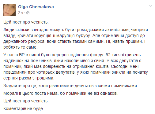 "Люди сколько угодно могут быть общественными активистами, чмориты власть, кричать коррупция-шмарупция-бубубу. Но получив доступ к государственным ресурсам, они становятся такими же. Нет, даже хуже. И делают то же самое", - пожаловалась Червакова.