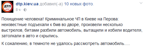 На бульваре Перова в Киеве неизвестные обстреляли автомобиль и похитили водителя. Об этом сообщает dtp.kiev.ua на своей странице в Facebook.