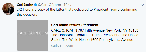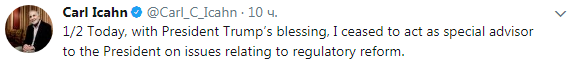 Миллиардер Карл Айкан заявил, что покидает пост специального советника президента США Дональда Трампа. Об этом он написал на своей странице в Twitter.