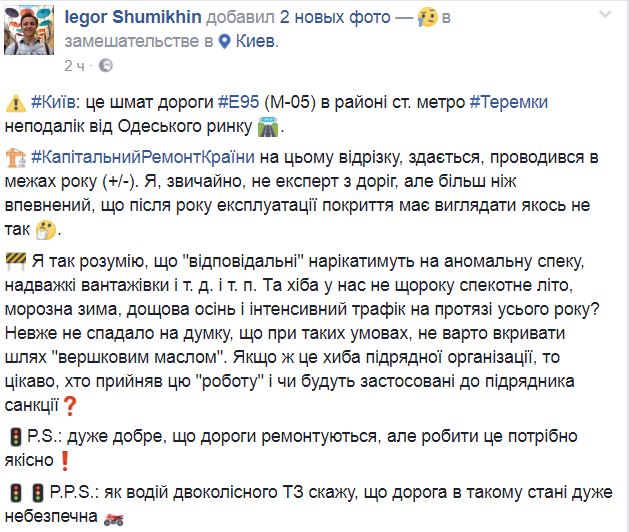 "Капитальный ремонт на этом отрезке, кажется, проводился в рамках года (+/-). Я, конечно, не эксперт по дорогам, но более чем уверен, что после года эксплуатации покрытия должен выглядеть как-то не так. Я так понимаю, что "ответственные" сетовать на аномальную жару, сверхтяжелые грузовики и т. д. Но разве у нас не каждый год жаркое лето, морозная зима, дождливая осень и интенсивный трафик на протяжении всего года? Неужели не приходило в голову, что при таких условиях, не стоит укрывать путь "сливочным маслом". Если же это недостаток подрядной организации, то интересно, кто принял эту "работу" и будут применены к подрядчику санкции?", - написал он на своей странице в социальной сети Facebook.