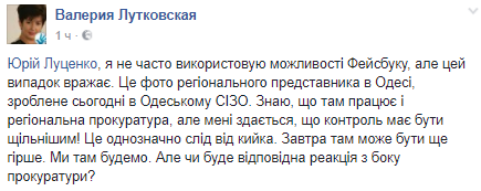 "Я редко использую возможности Фейсбука, но этот случай поражает. Это фото регионального представителя в Одессе, сделанное сегодня в Одесском СИЗО. Знаю, что там работает и региональная прокуратура, но мне кажется, что контроль должен быть более тщательным! Это однозначно след от дубинки. Завтра там может быть еще хуже. Мы там будем. Но будет соответствующая реакция со стороны прокуратуры?", - написала Лутковская.