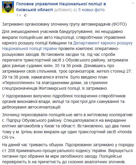 "Для обезвреживания участников бандгруппы, которые недавно похитили полицейское авто Нацполиции, сотрудники Управления уголовного розыска полиции Киевской области и Департамент уголовного розыска Национальной полиции Украины провели комплекс оперативно-розыскных мероприятий. Установили засады и, во время попытки перегнать транспортное средство из Обуховского района, задержали двух ранее судимых киевлян, 35 и 36 лет", - говорится в сообщении.