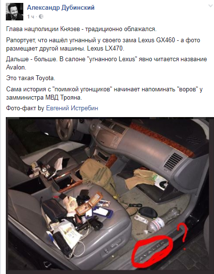 "Глава нацполиции Князев - традиционно облажался. Рапортует, что нашёл угнанный у своего зама Lexus GX460 - а фото размещает другой машины. Lexus LX470. Дальше - больше. В салоне "угнанного Lexus" явно читается название Avalon. Это такая Toyota. Сама история с "поимкой угонщиков" начинает напоминать "воров" у замминистра МВД Трояна", - написал Дубинский.