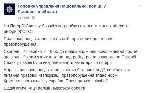 Во Львове с одной из памятных плит на Холме Славы похитили металлические буквы и цифры, сообщает пресс-служба областной Нацполиции в Facebook. Об этом стало известно сегодня, 21 августа.