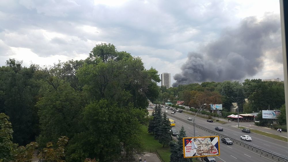 Над городом стоит огромный столб черного дыма. Предполагается, что пожар разгорелся в районе киностудии Довженко.