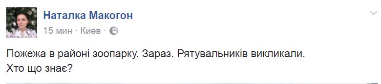 "Пожар в районе зоопарка. Сейчас. Спасателей вызвали. Кто что знает?", - пишет пользовательница Facebook Наталка Макогон.