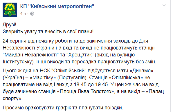 Так, 24 августа - до окончания мероприятий ко Дню Независимости Украины на вход и выход не будут работать станции "Майдан Независимости" и "Крещатик".