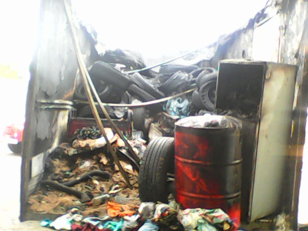 В результате пожара огнем были уничтожены посылки и вещи в грузовом отсеке автомобиля. Огнем повреждена металлическая емкость, в которой находилась красная жидкость неизвестного происхождения, по внешним признакам похожая на пестициды. Она вылилась на дорогу.