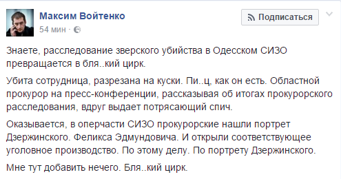 "Знаете, расследование зверского убийства в Одесском СИЗО превращается в ... цирк. Убита сотрудница, разрезана на куски. Пи..ц, как он есть. Областной прокурор на пресс-конференции, рассказывая об итогах прокурорского расследования, вдруг выдает потрясающий спич. Оказывается, в оперчасти СИЗО прокурорские нашли портрет Дзержинского. Феликса Эдмундовича. И открыли соответствующее уголовное производство. По этому делу. По портрету Дзержинского", - написал он.
