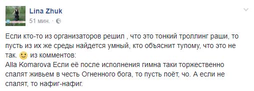 Lina Zhuk: "Если кто-то из организаторов решил , что это тонкий троллинг раши, то пусть из их же среды найдется умный, кто объяснит тупому, что это не так.