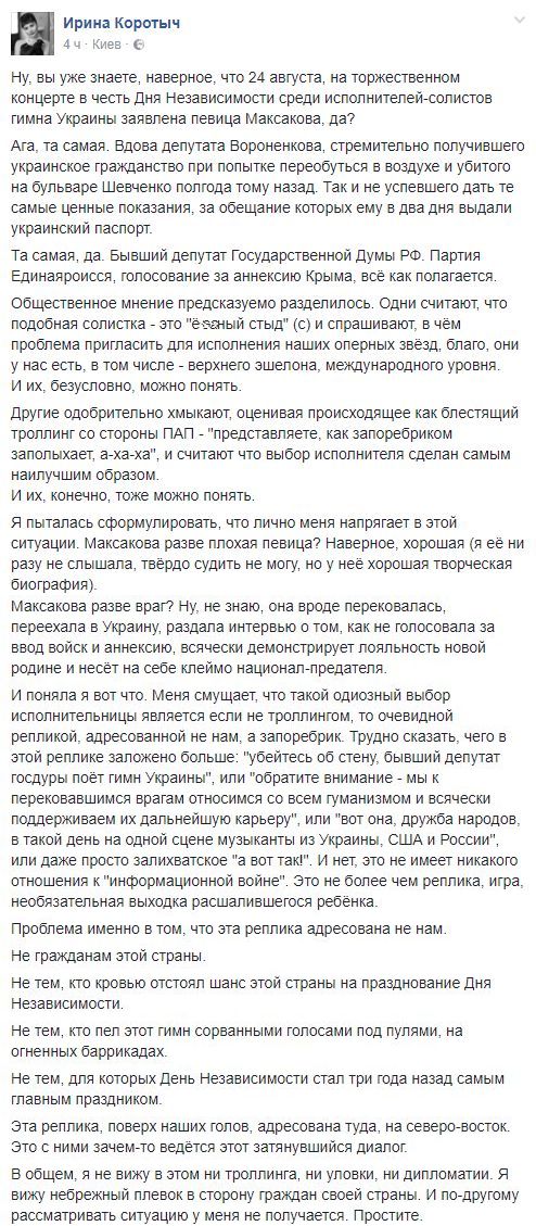 Ирина Коротыч, блогер: "Ну, вы уже знаете, наверное, что 24 августа, на торжественном концерте в честь Дня Независимости среди исполнителей-солистов гимна Украины заявлена певица Максакова, да? Ага, та самая. Вдова депутата Вороненкова, стремительно получившего украинское гражданство при попытке переобуться в воздухе и убитого на бульваре Шевченко полгода тому назад. Так и не успевшего дать те самые ценные показания, за обещание которых ему в два дня выдали украинский паспорт. Та самая, да. Бывший депутат Государственной Думы РФ. Партия Единаяроисся, голосование за аннексию Крыма, всё как полагается.