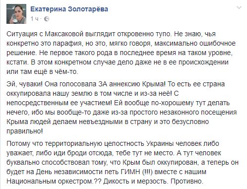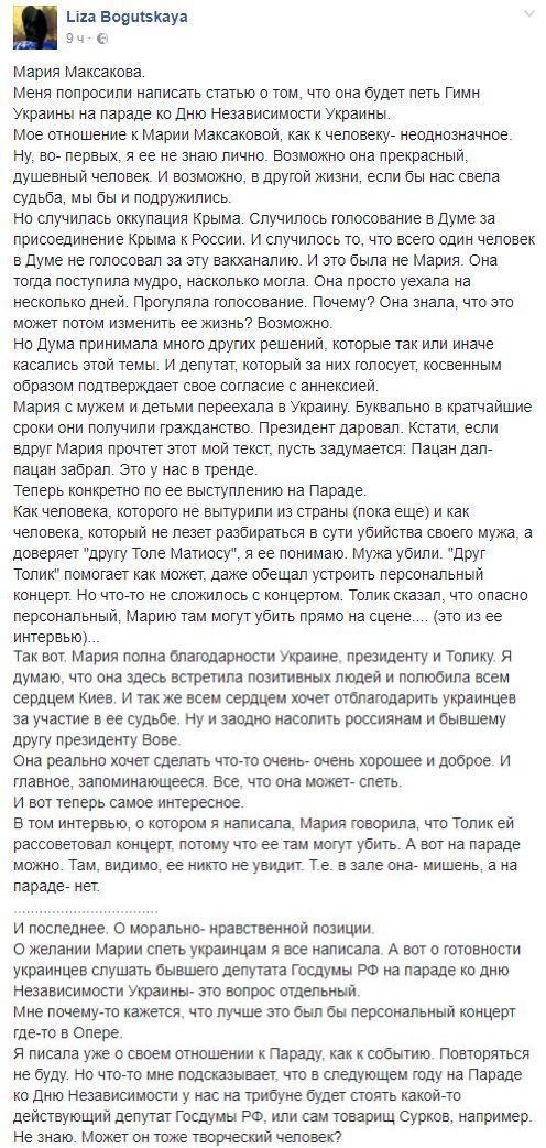 Елизавета Богуцкая, блогер: " Мария Максакова. Меня попросили написать статью о том, что она будет петь Гимн Украины на параде ко Дню Независимости Украины.