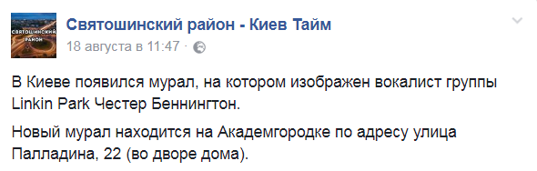 В Киеве появилось новое изображение-мурал. На доме по адресу: ул. Палладина, 22 нарисовали портрет умершего солиста американской группы "Linkin Park" Честера Беннингтона.
