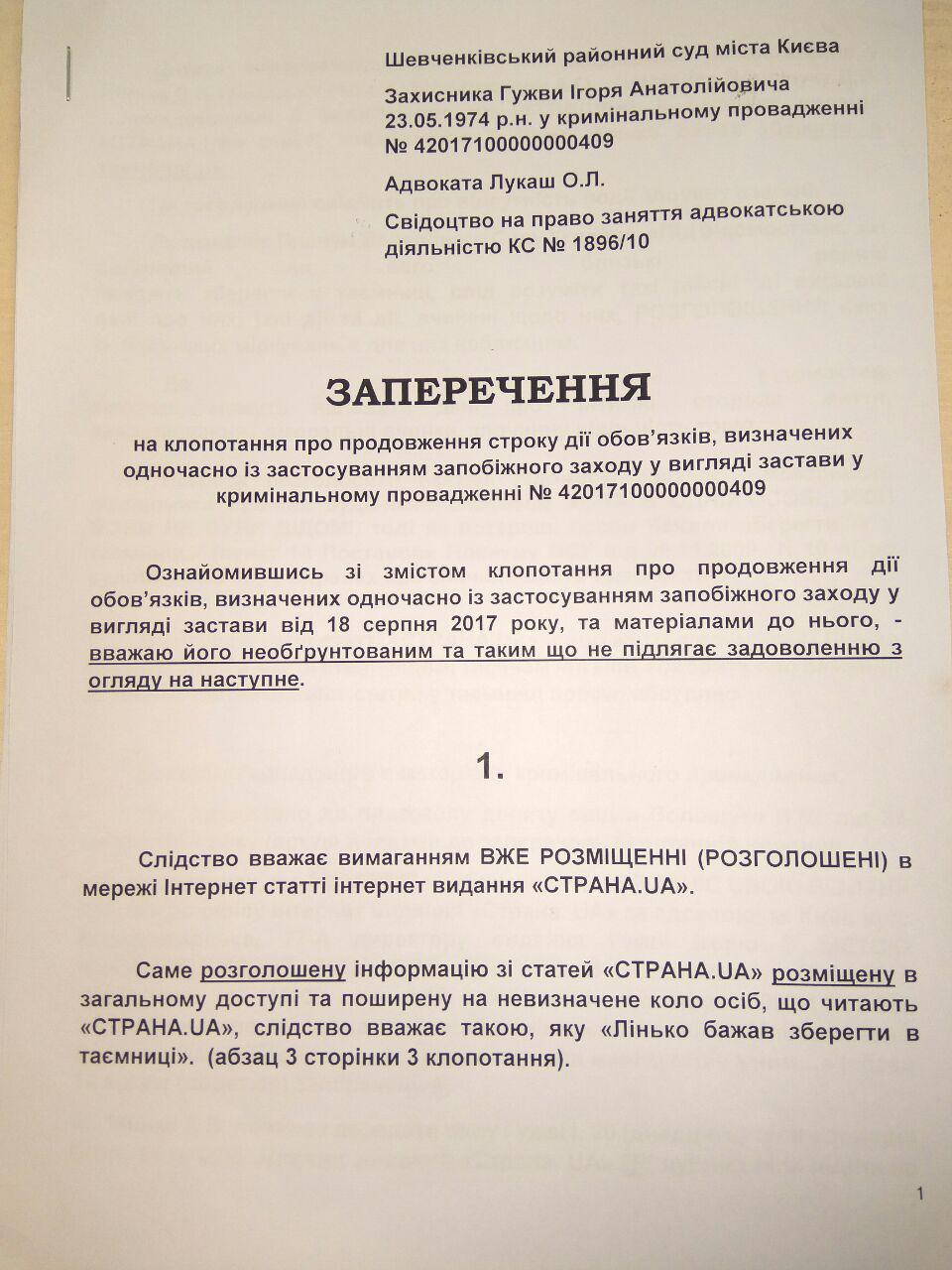 "Страна" публикует возражение адвоката Елены Лукаш на требование прокуратуры продлить меру пресечения главному редактору "Страны" Игорю Гужве.