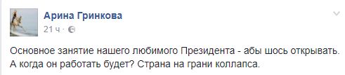Арина Гринкова: "Основное занятие нашего любимого Президента - абы шось открывать. А когда он работать будет? Страна на грани коллапса".
