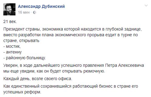 Александр Дубинский, журналист: "21 век. Президент страны, экономика которой находится в глубокой заднице, вместо разработки плана экономического прорыва ездит в турне по стране, открывать: