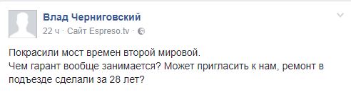 Влад Черниговский: "Покрасили мост времен второй мировой. Чем гарант вообще занимается? Может пригласить к нам, ремонт в подъезде сделали впервые за 28 лет?"