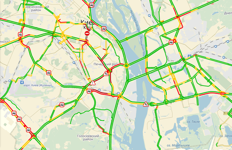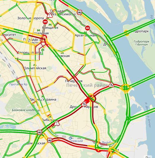 Также пробки наблюдаются на улице Саперно-Слободской, Михаила Заднепровского, проспекте Науки, Валерия Лобановского в районе Демеевской площади. Затор сформировался и вблизи от площади Лыбидской.