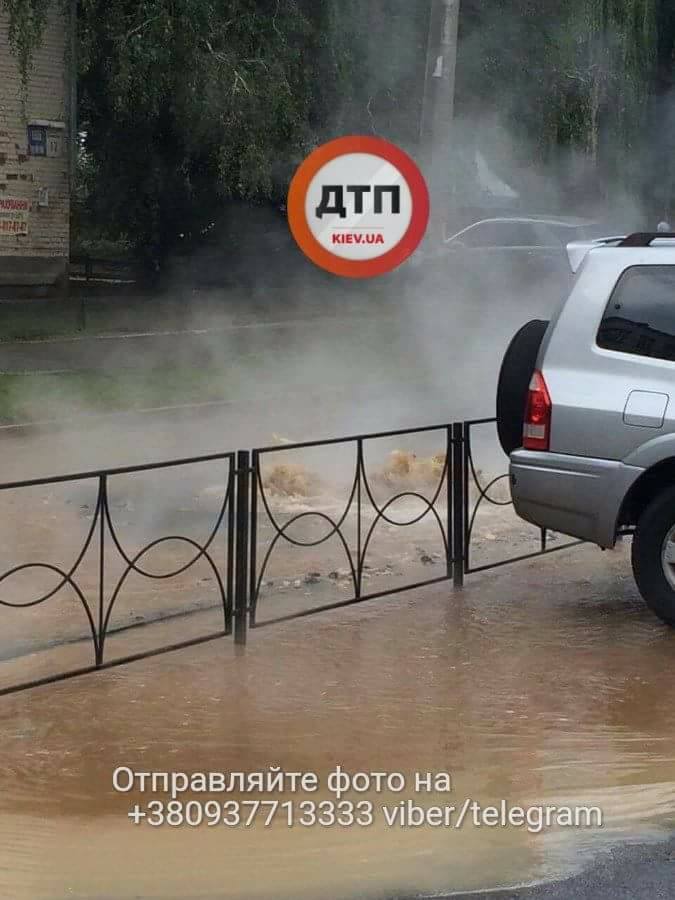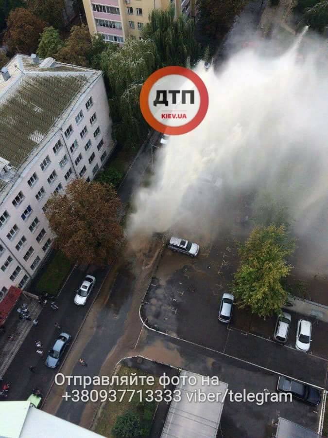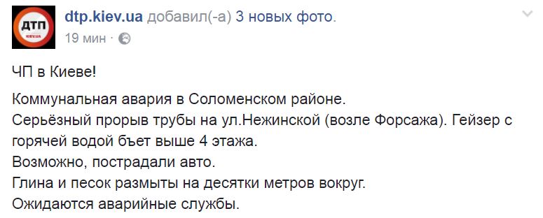 "Коммунальная авария в Соломенском районе. Серьезный прорыв трубы на ул. Нежинской (около Форсажа). Гейзер с горячей водой бьет выше 4 этажа", - говорится в сообщении.