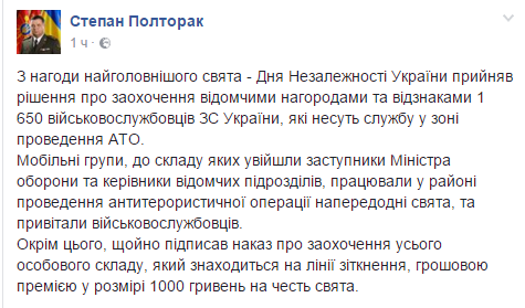 В среду вечером Полторак в своей странице в соцсети Facebook написал, что "подписал приказ о поощрении всего личного состава, находящегося на линии соприкосновения, денежной премией в размере 1000 гривень в честь праздника".