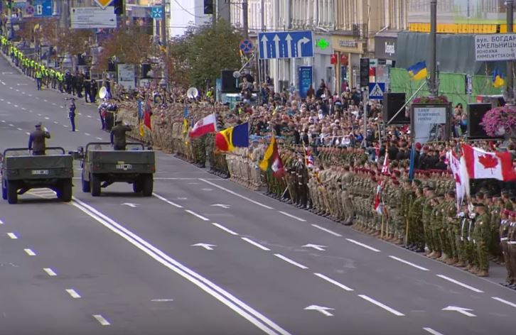 10:15  В параде принимают участие военные стран НАТО, судя по флагам. Их Полторак тоже поздравил.