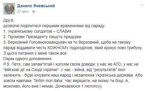 11:44  Пошла реакция на парад. Экс-телеведущий порошенковского 5 канала Данила Яневский заявил, что "речи президенту пишут придурки".