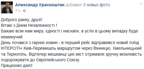 "В первый рейс отправился новый поезд "Интерсити+" Киев-Перемышль по маршруту через Винницу, Хмельницкий и Тернополь. Теперь жители этих городов получили удобную возможность путешествовать в ЕС", - написал он.
