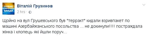 "Только что на ул. Грушевского был "терракт": бросали взрывпакеты по машине азербайджанского посольства... не докинули!!! Пострадала женщина и парень, которые шли рядом", - написал он.