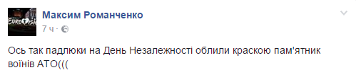"Вот так подлецы на День независимости облили краской памятник воинам АТО", – написал он.