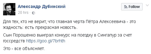 Дубинский написал, что сын Порошенко выиграл конкурс на поездку в Сингапур за счет госсредств, сославшись на новость издания "Капитал", которое, в свою очередь, ссылается на пресс-службу партии "Солидарность".