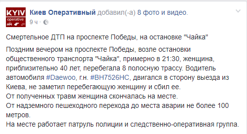 На проспекте Победы в Киеве у остановки "Чайка" автомобиль насмерть сбил женщину, которая перебегала дорогу. Об этом сообщает "Киев Оперативный" в Facebook.