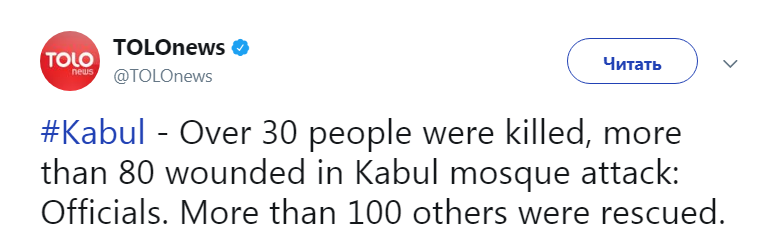 Власти Афганистана сообщили о более чем 30 погибших и по меньшей мере 80 раненых в результате теракта в столичной мечети.
