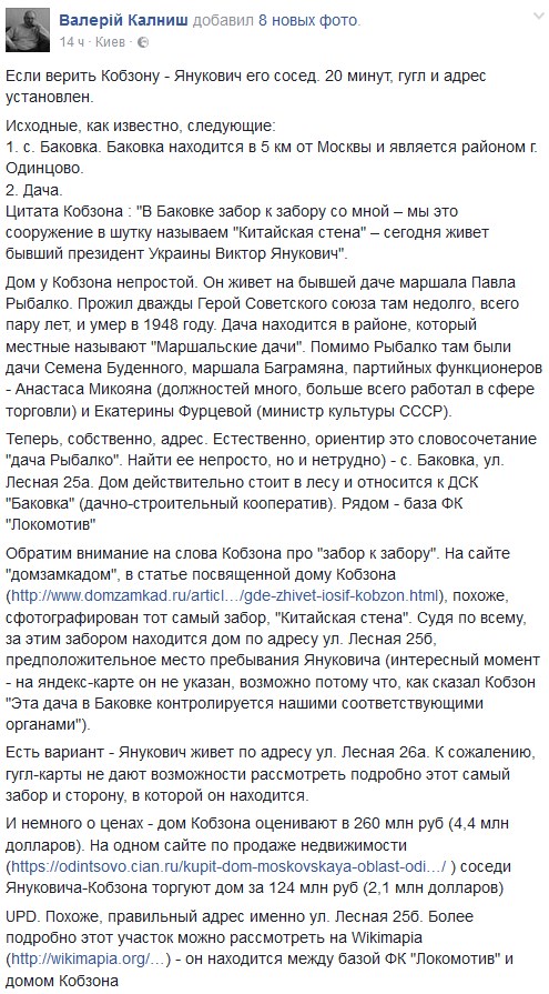 Учитывая тот факт, что Кобзон живет на бывшей даче маршала Павла Рыбалко по адресу с. Баковка, ул. Лесная 25а в Подмосковье, и помня слова российского певца о том, что от дома Януковича его отделяет "китайская стена", Калныш предположил, что экс-президент живет в доме 25б.