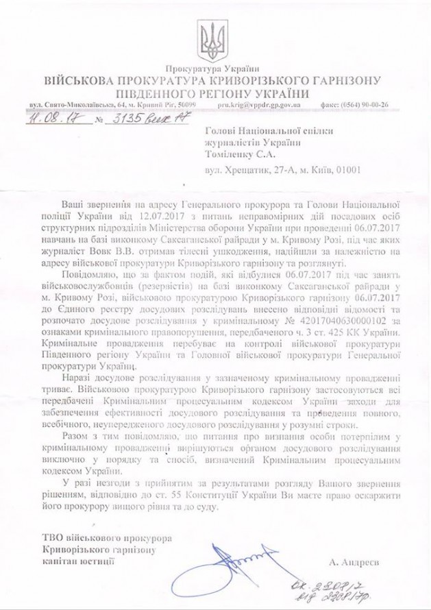 23 августа 2017 НСЖУ получило письмо от военной прокуратуры Криворожского гарнизона Южного региона Украины об открытии уголовного производства по ч.3 ст. 425 УК "Небрежное отношение к военной службе", которое предусматривает наказание от 5 до 7 лет за "Небрежное отношение военного служебного лица к службе, если это причинило существенный вред в условиях особого состояния, кроме военного".