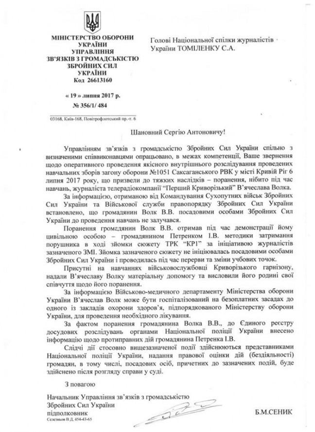 12 июля 2017 Национальный союз журналистов Украины (НСЖУ) обратился к Министерству Обороны Украины (МОУ) и Министерству здравоохранения с заявлениями, относительно проведения служебного расследования и обеспечения лечения, в том числе, за границей.