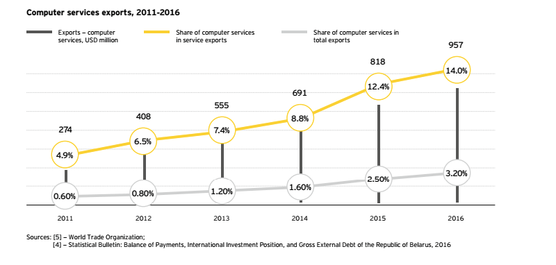 2. С 2005 по 2016 годы экспорт IT-услуг и продуктов вырос в 30 раз, а доля IT-экспорта в общем объеме экспорта товаров и услуг Беларуси выросла с 0,16 процента до 3,25 процента.