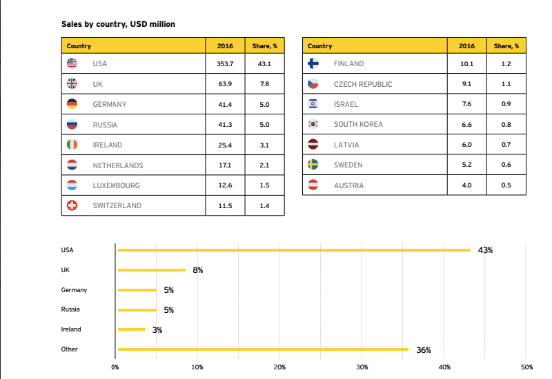 21. ПО, разработанное резидентами ПВТ в 2016 году, поступило "на вооружение" в 67 стран по всему миру. 49,1% экспорта пришелся на Западную Европу, а 43,1% - на США. Доля стран СНГ упала с 10,7 до 5,3% из-за падения экспорта в Россию на 43% в 2016 году.