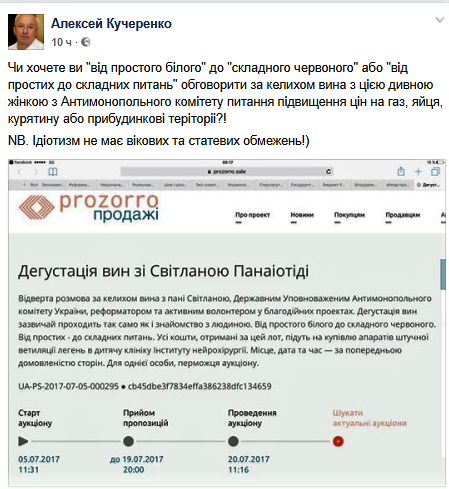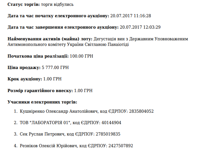 Из документации аукциона следует следующее: дегустацию вин перебила ставка в 5 777 гривен 20 июля 2017 года. Участниками выступили Александр Кушниренко, ТОВ "Лабораторія 01", Руслан Сек, а также Алексей Резников, который и стал победителем.