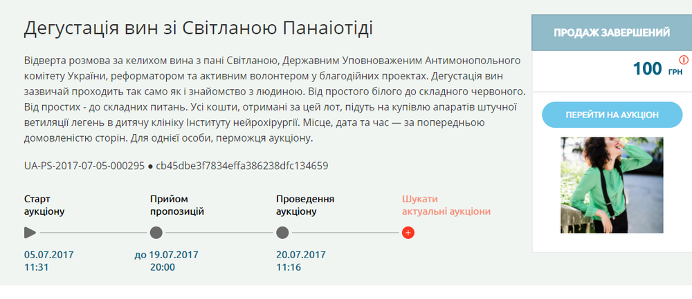 Новый лот - "Дегустация вин с волонтером, реформатором и госуполномоченной АКУ Светланой Панаиотиди" стартовал от 100 гривен.