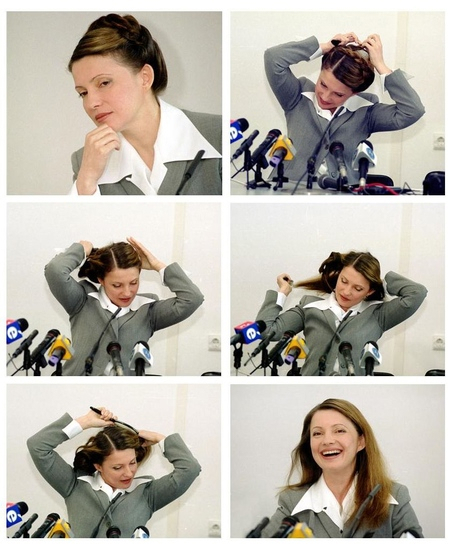 Радикальная смена имиджа времен Оранжевой революции. Юлия Тимошенко осветляет волосы, собирая их в знаменитую "косу-паляницю". В это время она проходит путь от и.о. премьера до полноценного Премьер-министра Украины.