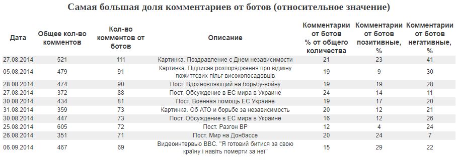 В Facebook президента количество оставлявших комментарии ботов относительно небольшое — 1500 аккаунтов, что составляет около 2% от общего количества комментаторов под постами на официальной странице Порошенко за три года.