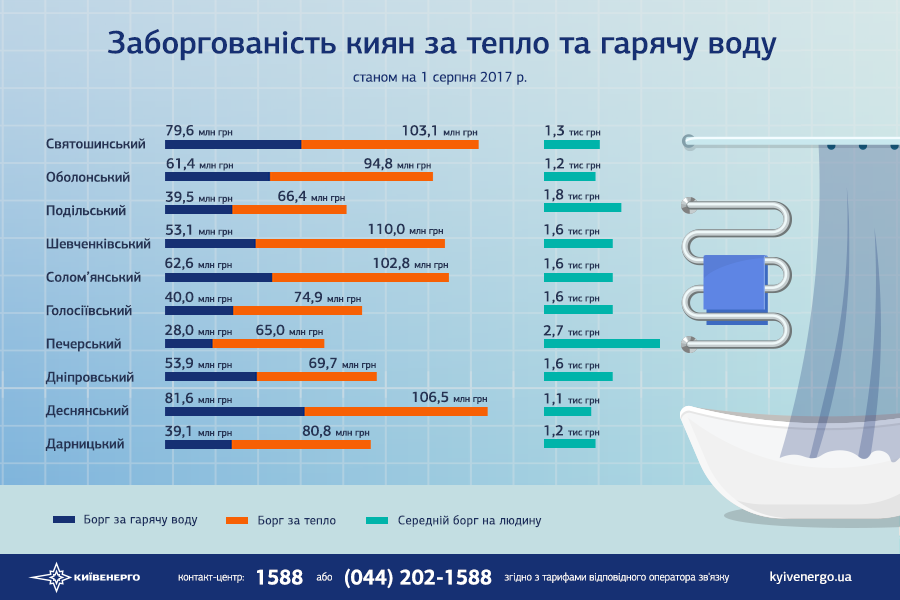 Суммарная задолженность населения за отопление и горячую воду перед "Киевэнерго" на 1 августа 2017 составила 1, 4 млрд грн. Задолженность жителей столицы за отопление составляет 874 100 000 грн, долг за горячую воду - 538 900 000 грн.