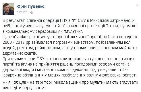 Эти лица подозреваются в создании преступной организации, которая на протяжении 2008 - 2017 годов занималась угрозами убийством, лишением свободы людей, рэкетом, рейдерством, угонами, присвоением имущества и государственных средств, сообщил генпрокурор Юрий Луценко на своей странице в Fаcebook.