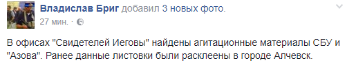 При этом один из функционеров "ДНР" в Facebook обнародовал фото листовок СБУ и "Азова", якобы найденных в офисе "Свидетелей Иеговы" которые, по его словам, ранее были расклеены в Алчевске.