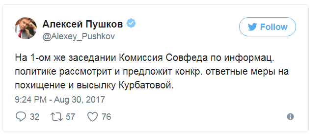 "На 1-ом же заседании Комиссия Совфеда по информационной политике рассмотрит и предложит конкретные ответные меры на похищение и высылку Курбатовой", – написал он.