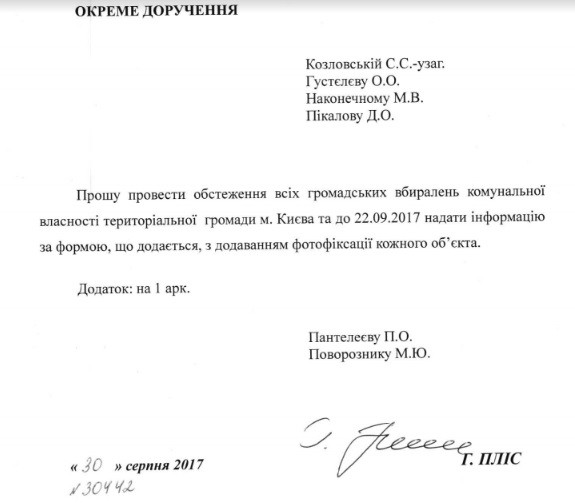 "Прошу провести обследование всех общественных туалетов коммунальной собственности территориальной общины Киева и до 22 сентября 2017 года предоставить информацию по форме, которая прилагается, с добавлением фотофиксации каждого объекта", - сказано в документе.