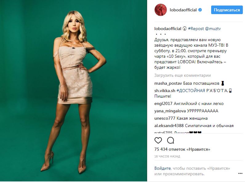 Певица Светлана Лобода стала ведущей хит-парада "10 Sexy" на российском канале МУЗ-ТВ. Об этом сообщается на сайте МУЗ-ТВ и в Instagram украинской знаменитости.