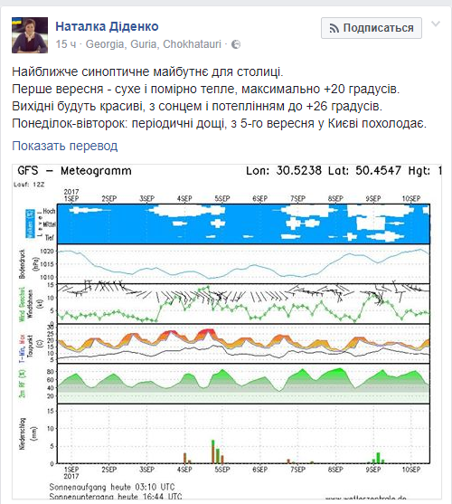 "Ближайшее синоптическое будущее для столицы. 1 сентября – сухое и умеренно теплое, максимально +20 градусов. Выходные будут красивые, с солнцем и потеплением до +26 градусов. Понедельник – вторник периодические дожди, с 5 сентября в Киеве похолодает", – написала Наталья Диденко.