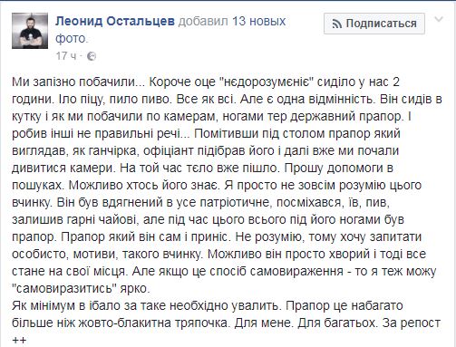 "Он был одет во все патриотическое, улыбался, ел, пил, оставил хорошие чаевые, но во время этого всего под его ногами был флаг. Флаг, который он сам и принес. Возможно, он просто больной и тогда все станет на свои места", - уточнил Остальцев.