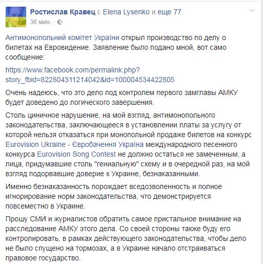 "Антимонопольный комитет Украины открыл производство по делу о билетах на Евровидение. Заявление было подано мной", - сообщает Кравец.